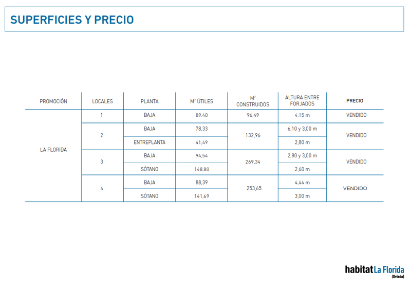 Habitat La Florida está ubicada al principio del Paseo de La Florida. Se desarrolla en forma de U con acceso desde las calles Corvera Carreño y Paseo de la Florida, en una zona residencial totalmente consolidada. Los locales se ubican en el perímetro del residencial teniendo el local 1 fachada al Paseo de la Florida, el 2 y el 3 se sitúan en el chaflán del edificio y el 4 da a la calle Corvera Carreño.